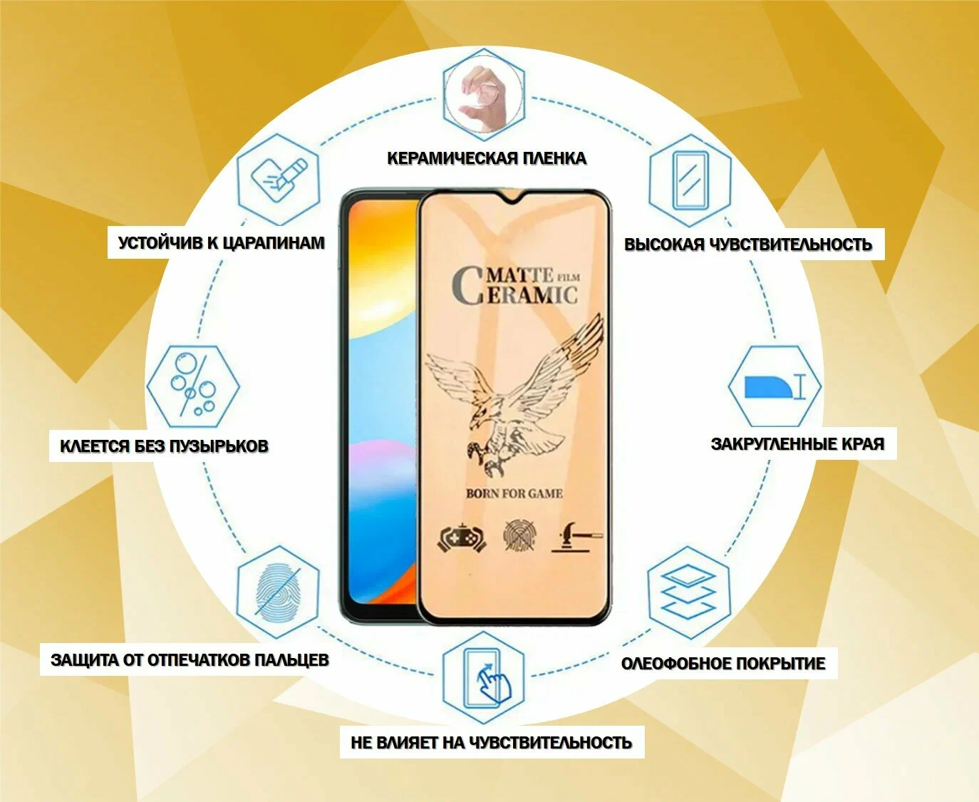 Представляет собой изготовленное по особой технологии полированное закалённое стекло с дополнительными слоями и скругленными краями. Изготавливается специально для смартфонов определенной модели - с вырезами под кнопку, динамики и датчики