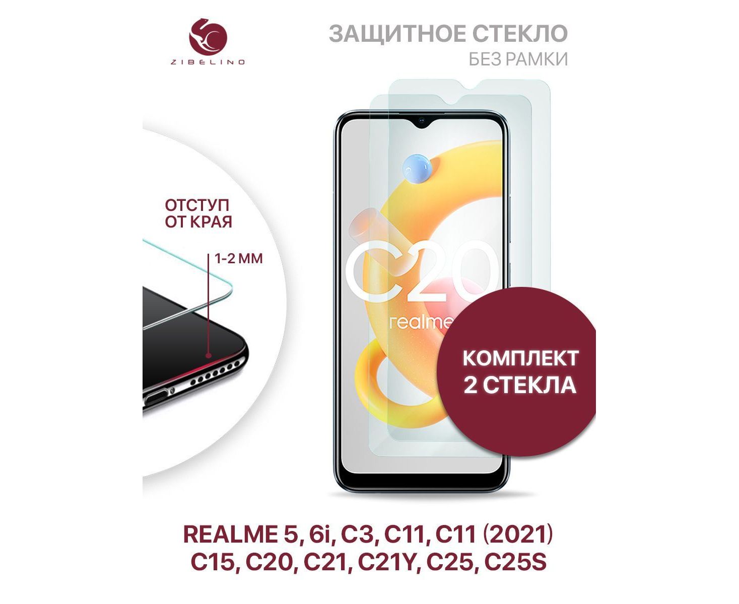Защитное стекло (Комплект 2 шт) для Realme 5, 6i, С3 С11, C11 2021, C15 C20 С21, C21Y C25, C25S без рамки с отступом от краев, Реалми 5 6i С3 С11 С11 2021 С15 С20 С21 С21У С25 С25S