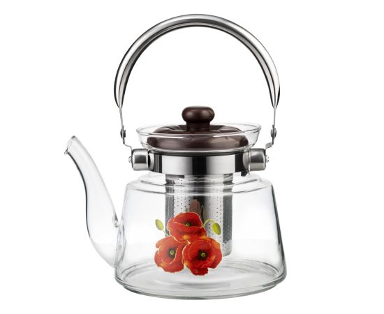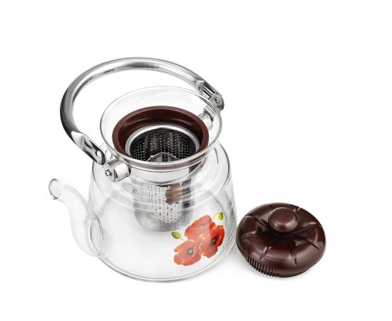 Отличный заварочный чайник LARA подойдёт для большой семьи, где любят и ценят чай. С его помощью вы сможете приготовить 5-6 порций ароматного напитка любых сортов и разновидностей. Рисунок на колбе в виде цветка дополняет образ, что позволяет чайнику вписаться в любой интерьер. При изготовлении были выбраны экологически чистые и безопасные материалы. Высококачественное жаропрочное стекло подходит для электрических и газовых плит, вы можете смело ставить чайник на открытый огонь. Ручка из нержавейки и жароупорная бакелитовая крышка не нагреваются. Жёсткий фильтр для заваривания из нержавеющей стали легко снимается для мытья и очистки.